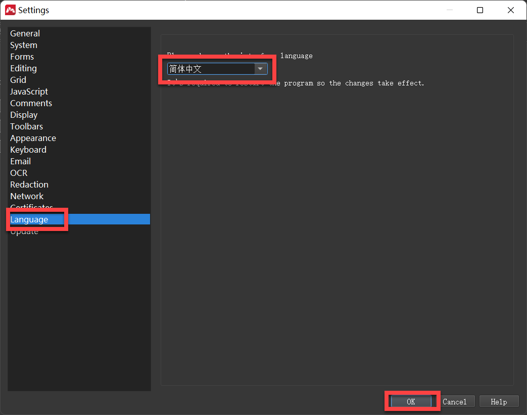 3、中文设置:打开软件依次点击菜单栏→Tools→Settings→Language→简体中文→OK