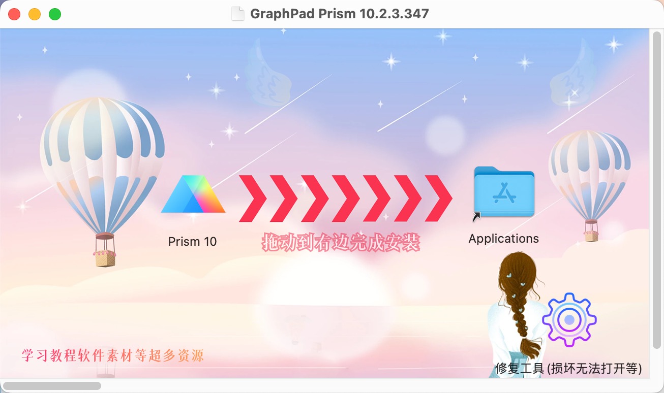 打开本站下载的GraphPad Prism 10安装包,拖动软件Prism 10到右边的应用程序中进行安装。